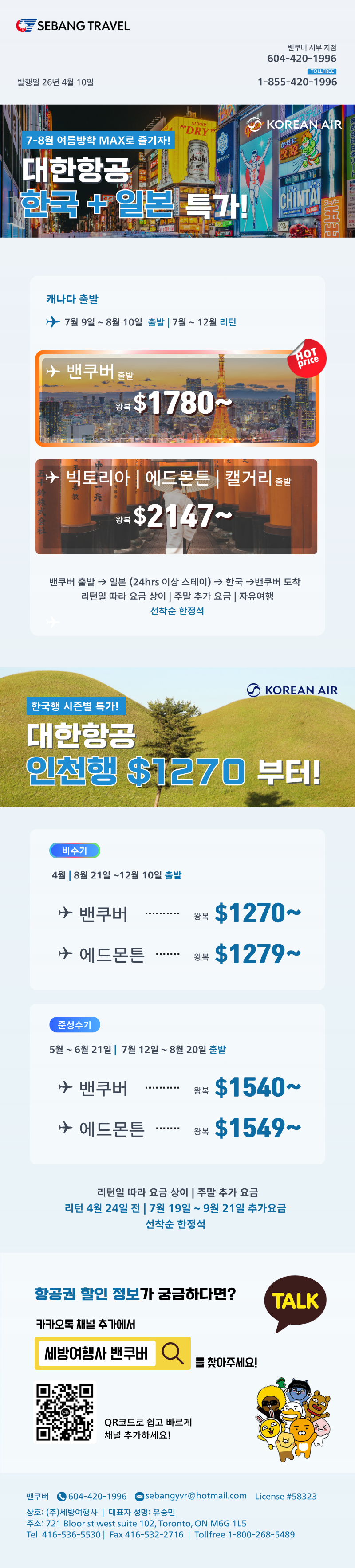 | [세방여행레터] 대한항공 2024비수기 깜짝세일 6/17(월)까지 연장, 토론토 $1870 밴쿠버 $1654부터 | 2024/06/14 | 2024-06-14 14:45:02 |
