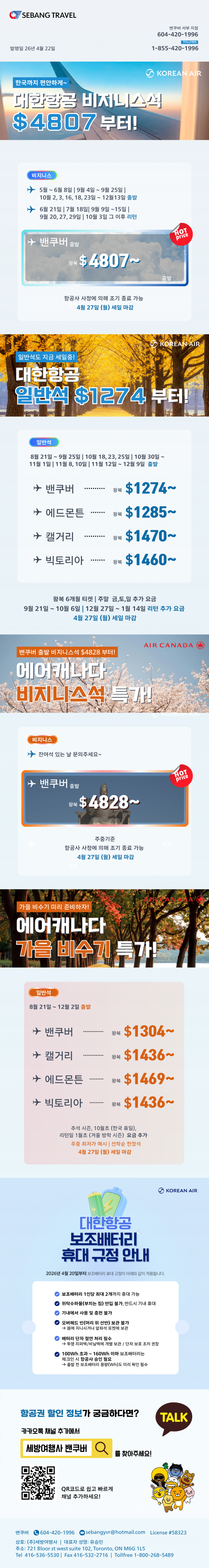 | 에어캐나다 $300 OFF 오늘까지, 대한항공 기종변경 비지니스석 /일반석스페셜 왕복$2023 부터 | 2024/08/23 | 2024-08-23 14:58:15 |
