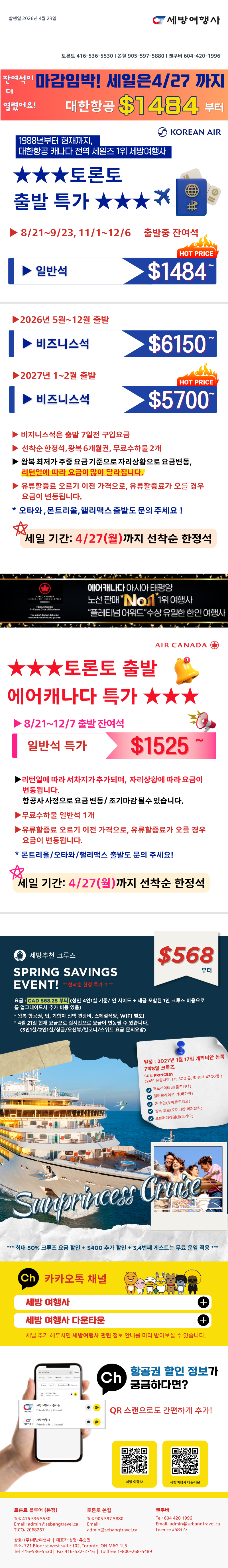 [세방여행레터] 서두르세요! 대한항공/에어캐나다 준성수기 깜짝스페셜! 왕복 $2066부터2024/06/192024-06-19 19:50:42